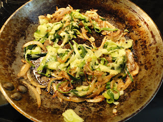 While the sauce flavors melded, I squeezed the eggplant dry, and very gently sauteed all of the veggies in a splash of olive oil. The idea is not to brown the veggies, but to significantly reduce their moisture. Ordinarily I would have added a chopped onion and bell pepper as well to this mixture, and I suggest you do. I just didn't want to push things too far on this first foray into the forbidden foods.